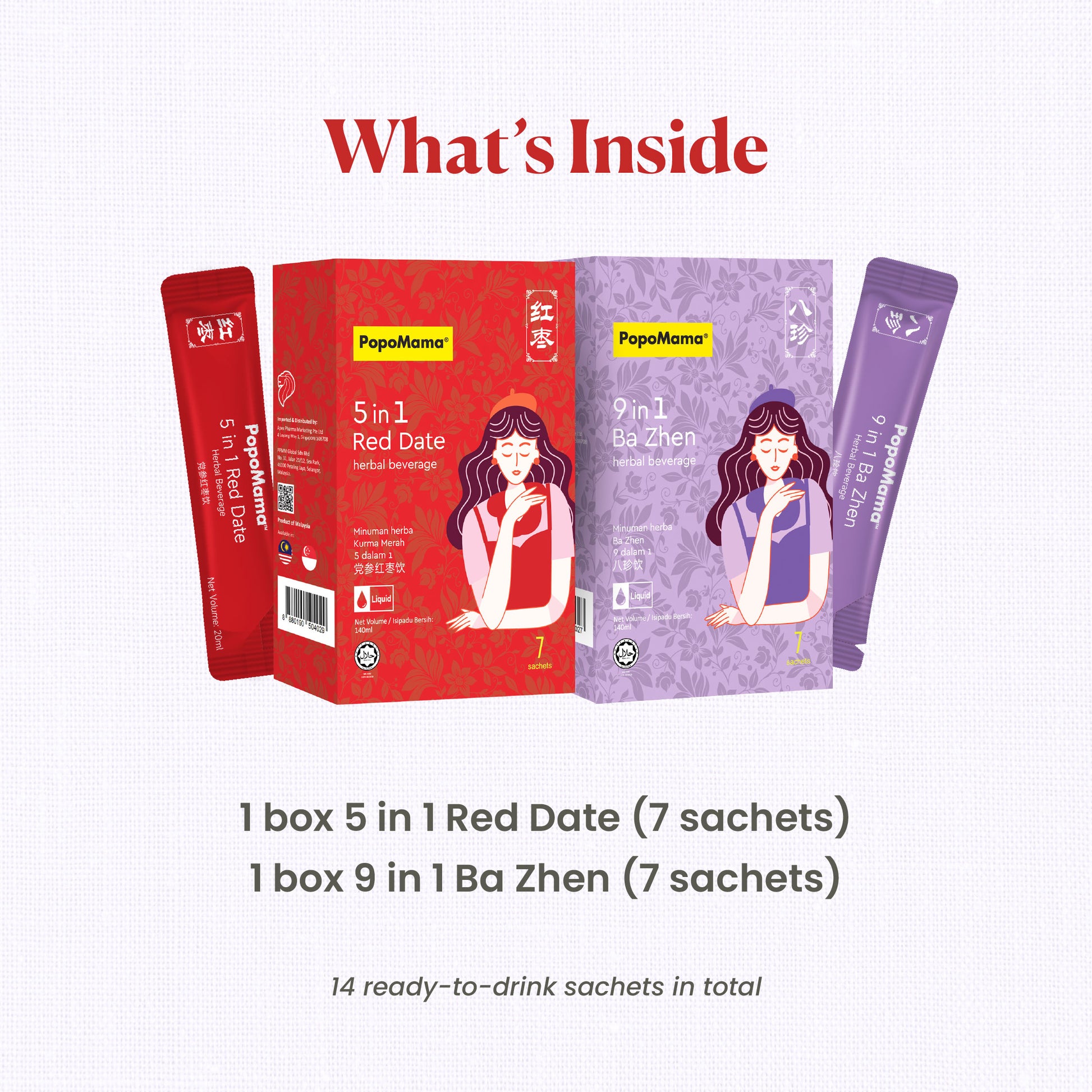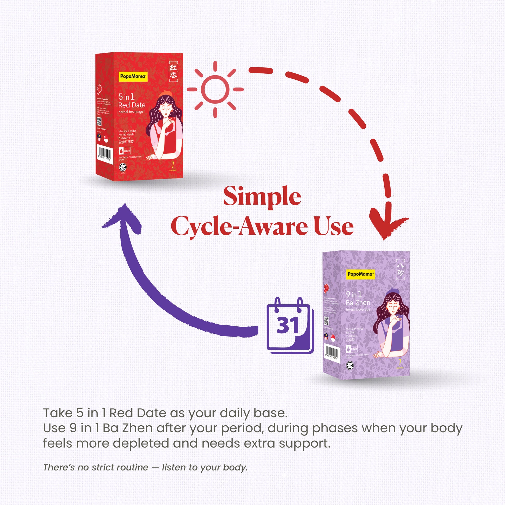 It combines 5 in 1 Red Date for daily replenishment and 9 in 1 Ba Zhen for cycle support after your period, allowing you to understand what your body needs — before committing to a longer routine.
