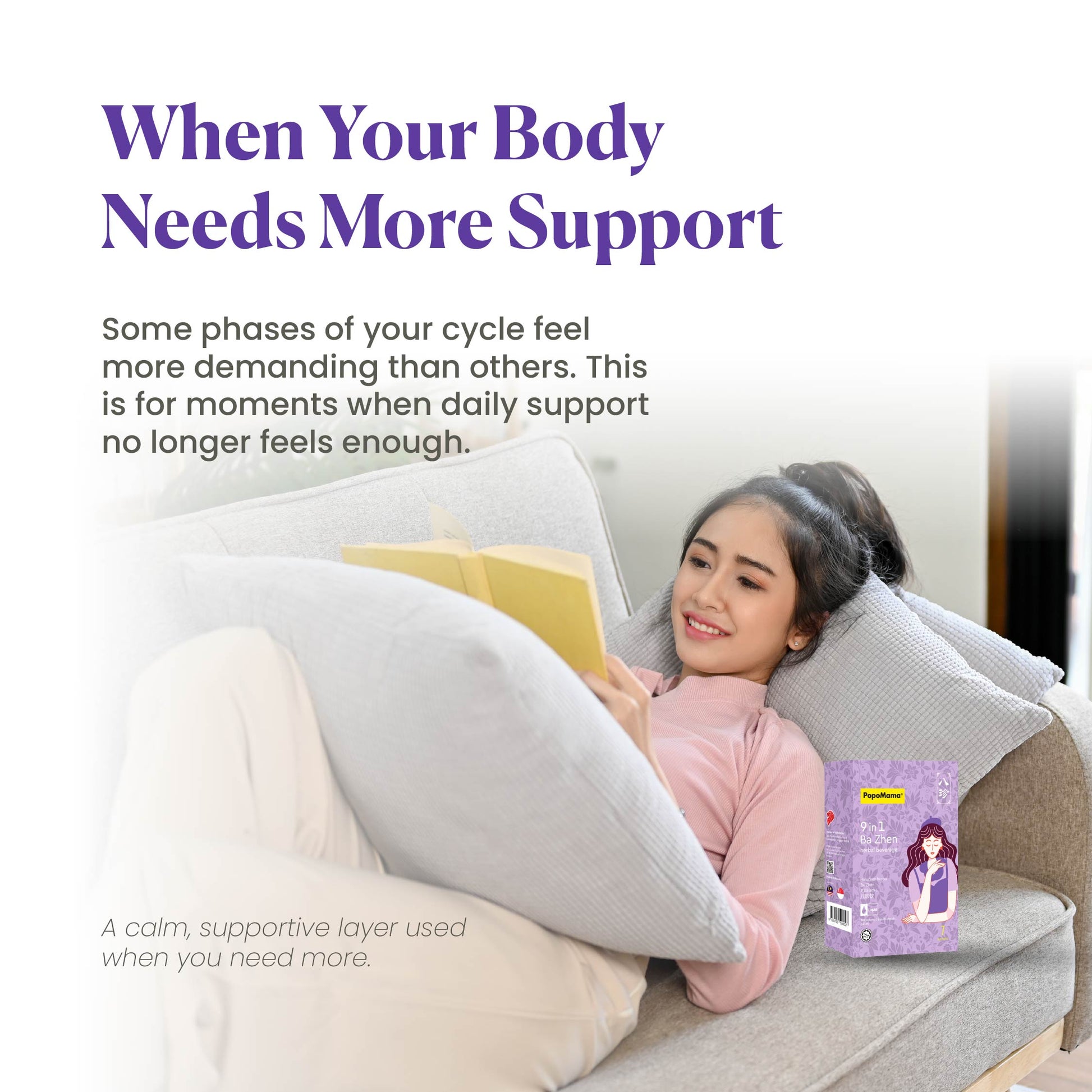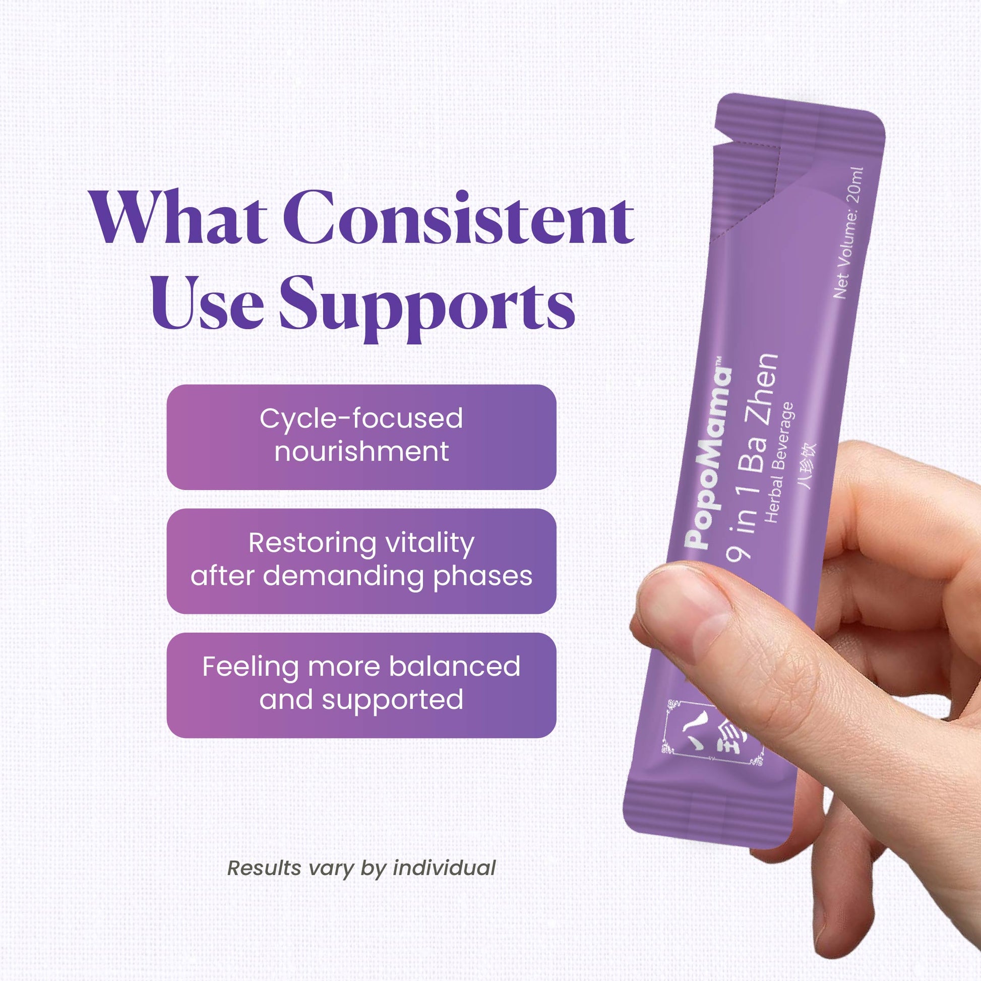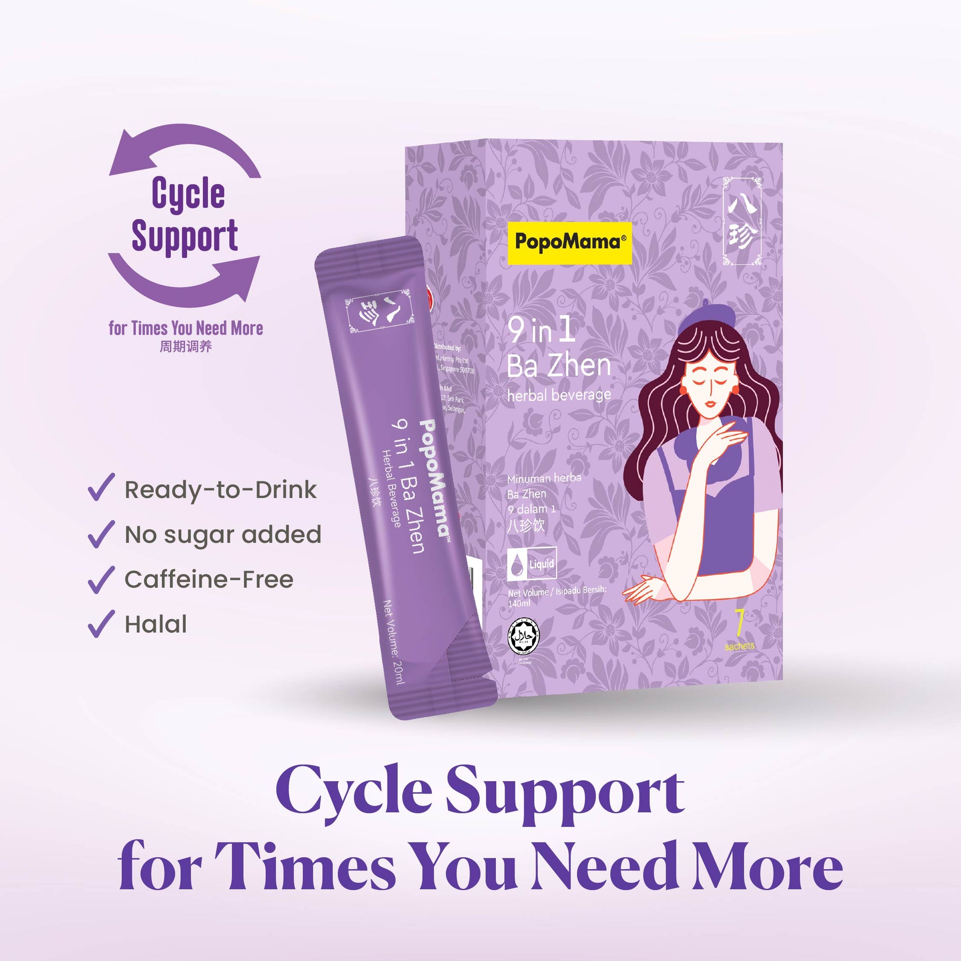 PopoMama 9 合 1 八珍草本饮品旨在更深层次地支持月经周期,采用传统的八珍草本配方,以现代食品为基础,即饮形式制成。